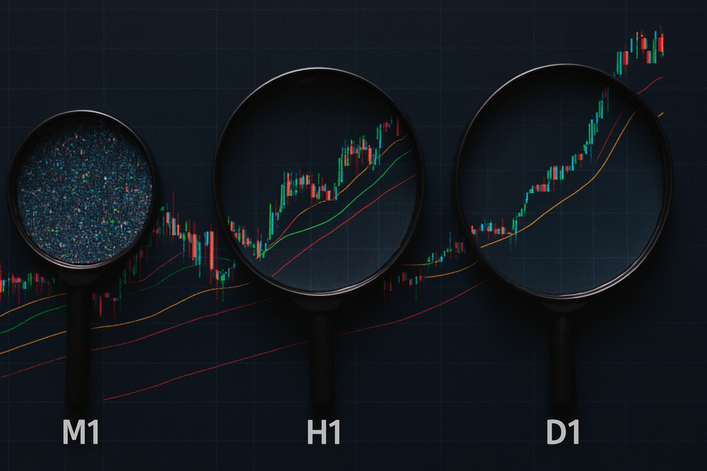 در نگاه اول، تایم‌فریم فقط بازه زمانی هر کندل در نمودار است. اما در واقعیت، تایم‌فریم دریچه ادراک شما از بازار است.