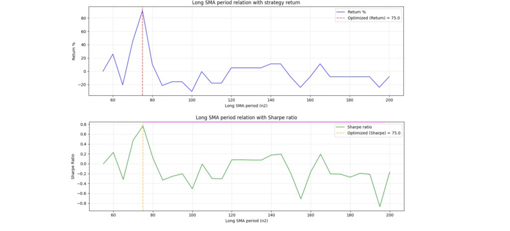 ما یک حلقه میزنیم و استراتژی را با مقادیر مختلف n2 (مثلاً از ۵۵ تا ۲۰۰) اجرا میکنیم. سپس خروجی هر اجرا را ذخیره و در پایان، مقداری که بالاترین بازده را داشته، انتخاب میکنیم.