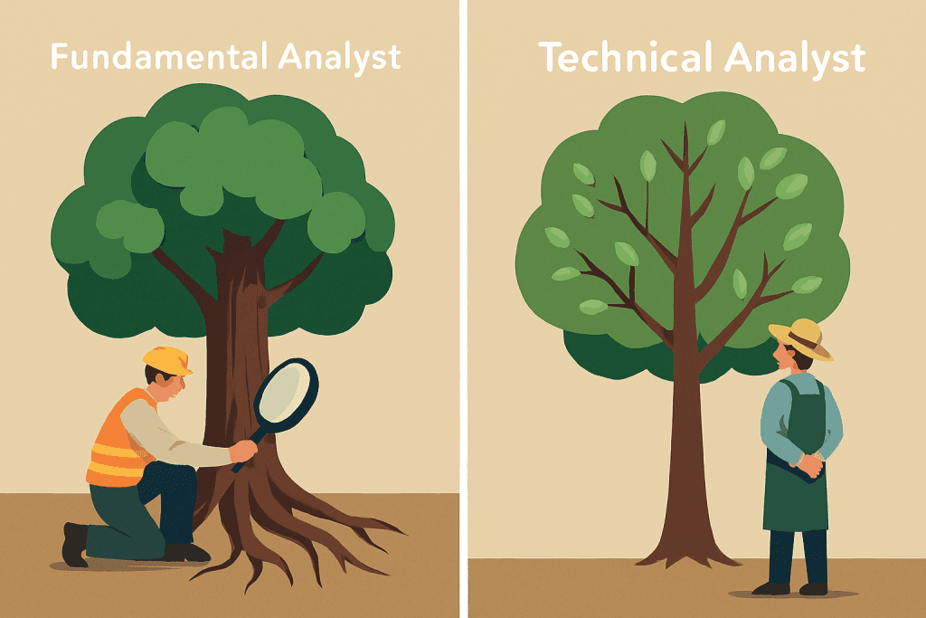 تحلیل بنیادی دقیقاً مانند نگاه مهندس جنگل است: بررسی عمق و بنیاد یک دارایی برای سنجش ارزش ذاتی آن. در مقابل، تحلیل تکنیکال مانند کار باغبان است: مطالعه حرکت‌های گذشته قیمت بر روی نمودارها برای پیش‌بینی حرکت آینده.